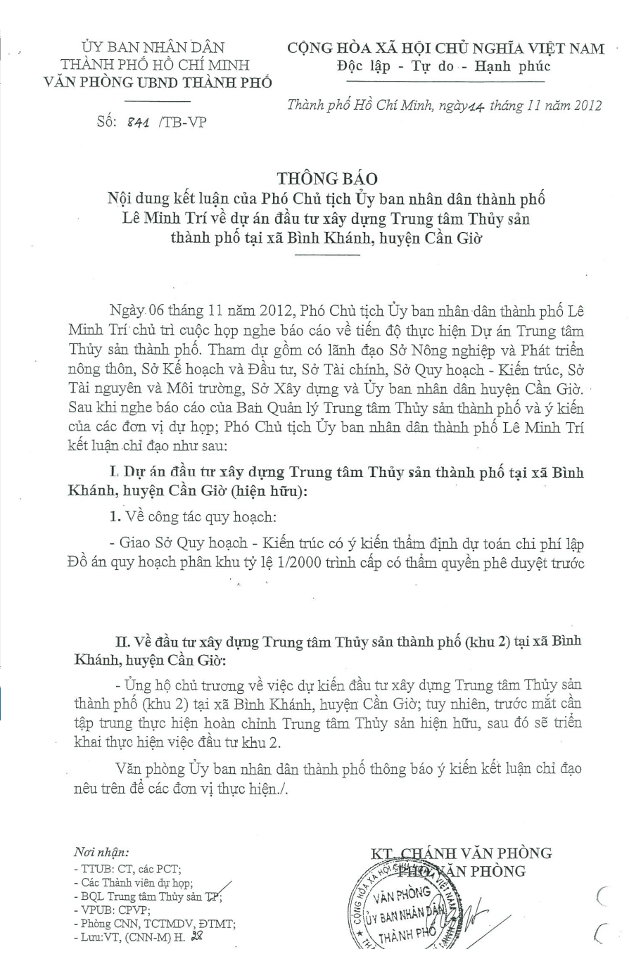 Được UBND Thành phố phê duyệt Đồ án Quy hoạch phân khu 1/2000 Trung tâm Thủy sản thành phố, xã Bình Khánh, huyện Cần Giờ (Quyết định số 4047/QĐ-UBND ngày 26/7/2013, tổng diện tích: 99,96 ha) .